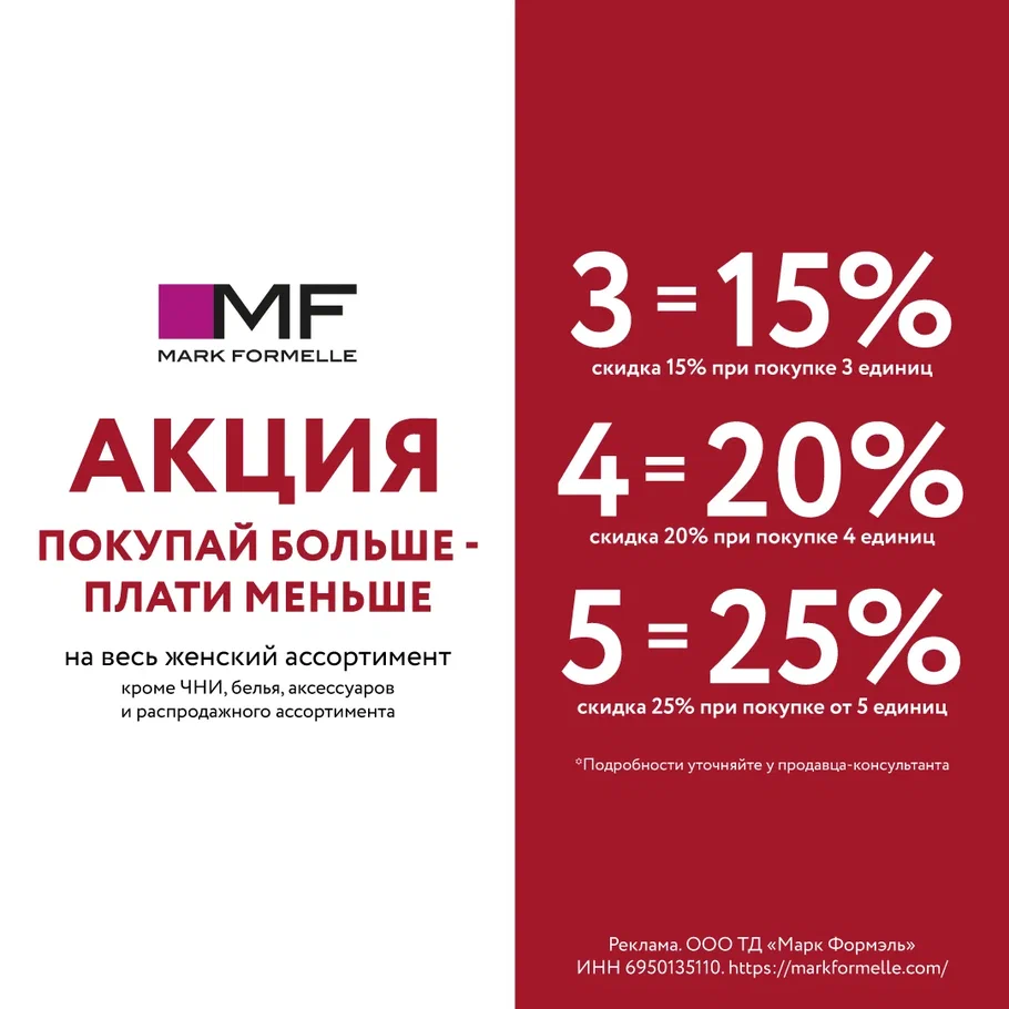 Специальное предложение распространяется на весь женский ассортимент, кроме чулочно-носочных изделий, белья, аксессуаров и товаров на распродаже.